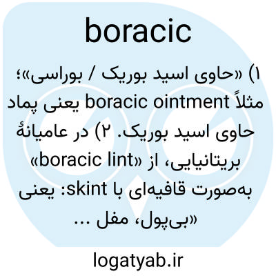 ۱) «حاوی اسید بوریک / بوراسی»؛ مثلاً boracic ointment یعنی پماد حاوی اسید بوریک. ۲) در عامیانهٔ بریتانیایی، از «boracic lint» به‌صورت قافیه‌ای با skint: یعنی «بی‌پول، مفلس».
