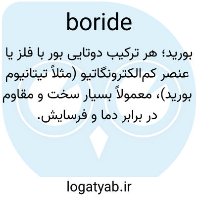 بورید؛ هر ترکیب دوتایی بور با فلز یا عنصر کم‌الکترونگاتیو (مثلاً تیتانیوم بورید)، معمولاً بسیار سخت و مقاوم در برابر دما و فرسایش.