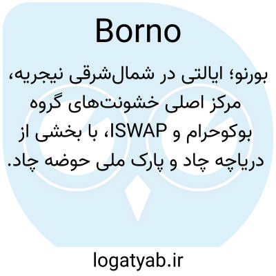 📌 ایالتی در شمال شرقی نیجریه، در کنار دریاچه چاد. پایتخت: مایدوگوری. جمعیت: ۴۱۵۱۱۹۳ (۲۰۰۶). مساحت: ۷۰۸۹۸ کیلومتر مربع (۲۷۳۷۴ مایل مربع)