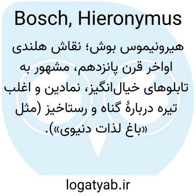 هیرونیموس بوش؛ نقاش هلندی اواخر قرن پانزدهم، مشهور به تابلوهای خیال‌انگیز، نمادین و اغلب تیره دربارهٔ گناه و رستاخیز (مثل «باغ لذات دنیوی»).