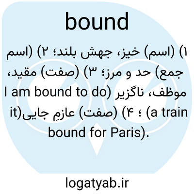 ۱) (اسم) خیز، جهش بلند؛ ۲) (اسم جمع) حد و مرز؛ ۳) (صفت) مقید، موظف، ناگزیر (I am bound to do it)؛ ۴) (صفت) عازمِ جایی (a train bound for Paris).