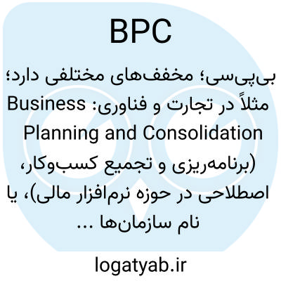 بی‌پی‌سی؛ مخفف‌های مختلفی دارد؛ مثلاً در تجارت و فناوری: Business Planning and Consolidation (برنامه‌ریزی و تجمیع کسب‌وکار، اصطلاحی در حوزه نرم‌افزار مالی)، یا نام سازمان‌ها و شرکت‌های مختلف. معنی دقیقش بستگی به زمینه دارد.