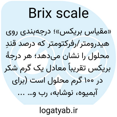 «مقیاس بریکس»؛ درجه‌بندی روی هیدرومتر/رفرکتومتر که درصد قندِ محلول را نشان می‌دهد؛ هر درجهٔ بریکس تقریباً معادل یک گرم شکر در ۱۰۰ گرم محلول است (برای آبمیوه، نوشابه، رب و… به‌کار می‌رود).