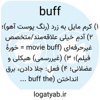 ۱) کرم مایل به زرد (رنگ پوست آهو)؛ ۲) آدمِ خیلی علاقه‌مند/متخصص غیرحرفه‌ای (movie buff = خورهٔ فیلم)؛ ۳) (غیررسمی) هیکلی و عضلانی؛ ۴) فعل: جلا دادن، برق انداختن (buff the surface).