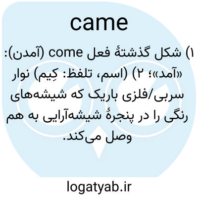 ۱) شکل گذشتهٔ فعل come (آمدن): «آمد»؛ ۲) (اسم، تلفظ: کِیم) نوار سربی/فلزی باریک که شیشه‌های رنگی را در پنجرهٔ شیشه‌آرایی به هم وصل می‌کند.