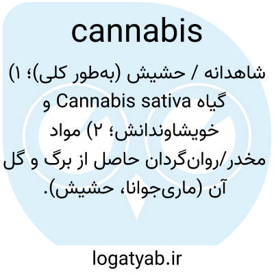 📌 هر یک از قسمتهای مختلف گیاه، به ویژه برگها و سرشاخههای گلدار گیاه C. sativa، که از آن حشیش، ماریجوانا، بنگ و داروهای مشابه با سرخوشی خفیف و توهمزا تهیه میشود.