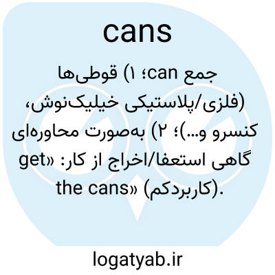 جمع can؛ ۱) قوطی‌ها (فلزی/پلاستیکی خیلیک‌نوش، کنسرو و…)؛ ۲) به‌صورت محاوره‌ای گاهی استعفا/اخراج از کار: «get the cans» (کم‌کاربرد).