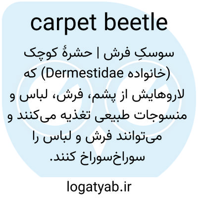 📌 هر یک از چندین سوسک کوچک خانوادهی Dermestidae که لاروهای آنها آفات خانگی هستند و از فرش و سایر پارچههای پشمی تغذیه میکنند، به ویژه سوسک فرش گاومیشی Anthrenus scrophulariae و سوسک فرش سیاه Attagenus piceus.