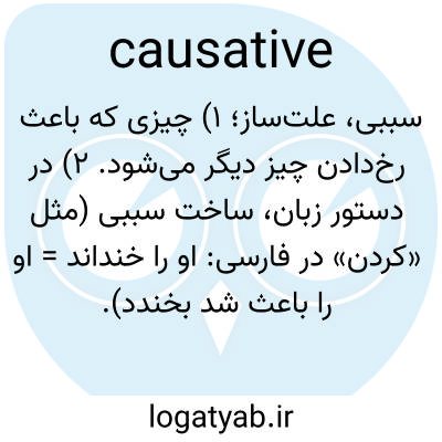 📌 دستور زبان.، کلمه، به خصوص فعل، که به علیت اشاره میکند، همانطور که در جملهی «او مرا وادار کرد سیب را بخورم» ساخته شده است.