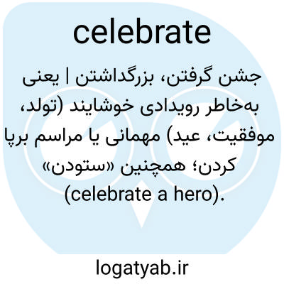 جشن گرفتن، بزرگداشتن | یعنی به‌خاطر رویدادی خوشایند (تولد، موفقیت، عید) مهمانی یا مراسم برپا کردن؛ همچنین «ستودن» (celebrate a hero).