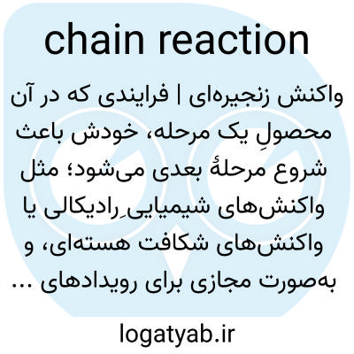 واکنش زنجیره‌ای | فرایندی که در آن محصولِ یک مرحله، خودش باعث شروع مرحلهٔ بعدی می‌شود؛ مثل واکنش‌های شیمیایی ِرادیکالی یا واکنش‌های شکافت هسته‌ای، و به‌صورت مجازی برای رویدادهای پشت سرهم هم به‌کار می‌رود.
