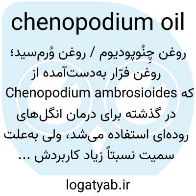 روغن چِنُوپودیوم / روغن وُرم‌سید؛ روغن فرّار به‌دست‌آمده از Chenopodium ambrosioides که در گذشته برای درمان انگل‌های روده‌ای استفاده می‌شد، ولی به‌علت سمیت نسبتاً زیاد کاربردش محدود شده است.
