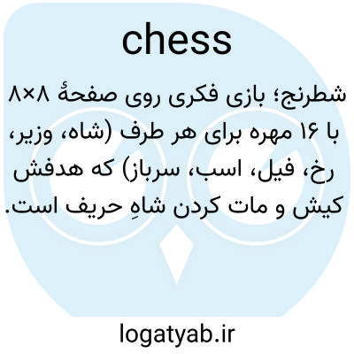 📌 بازی‌ای که روی صفحه شطرنج توسط دو نفر انجام می‌شود و هر کدام شانزده مهره را طبق قوانین حاکم بر حرکت شش نوع مهره (پیاده، رخ، اسب، فیل، وزیر، شاه) حرکت می‌دهند و هدف آن کیش و مات کردن شاه حریف است.