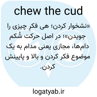 📌 همچنین، بجوید. تأمل کنید، مراقبه کنید، همانطور که در یوحنا تمایل دارد قبل از پاسخ دادن نشخوار کند، یا بگذارید آن را بجوم و به شما اطلاع دهم. اصطلاح اول، که اولین بار در سال ۱۳۸۲ ثبت شد، ظاهر یک گاو صبور در حال نشخوار را به فردی که عمیقاً در فکر است منتقل میکند. این نوع برای اولین بار در سال ۱۶۹۶ ثبت شد.