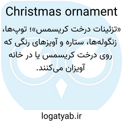 «تزئینات درخت کریسمس»؛ توپ‌ها، زنگوله‌ها، ستاره و آویزهای رنگی که روی درخت کریسمس یا در خانه آویزان می‌کنند.