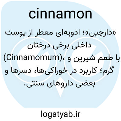 «دارچین»؛ ادویه‌ای معطر از پوست داخلی برخی درختان (Cinnamomum)، با طعم شیرین و گرم؛ کاربرد در خوراکی‌ها، دسرها و بعضی داروهای سنتی.