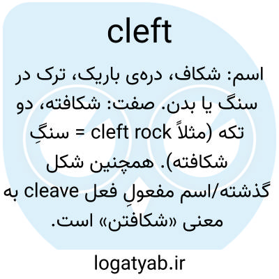 اسم: شکاف، دره‌ی باریک، ترک در سنگ یا بدن. صفت: شکافته، دو تکه (مثلاً cleft rock = سنگِ شکافته). همچنین شکل گذشته/اسم مفعولِ فعل cleave به معنی «شکافتن» است.