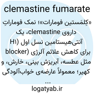 «کِلمَستین فومارات»؛ نمک فوماراتِ داروی clemastine، یک آنتی‌هیستامین نسل اول (H1 blocker) برای کاهش علائم آلرژی مثل عطسه، آبریزش بینی، خارش، و کهیر؛ معمولاً عارضه‌ی خواب‌آلودگی هم می‌دهد.