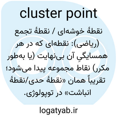 نقطهٔ خوشه‌ای / نقطهٔ تجمع (ریاضی): نقطه‌ای که در هر همسایگیِ آن بی‌نهایت (یا به‌طور مکرر) نقاط مجموعه پیدا می‌شود؛ تقریباً همان «نقطهٔ حدی/نقطهٔ انباشت» در توپولوژی.