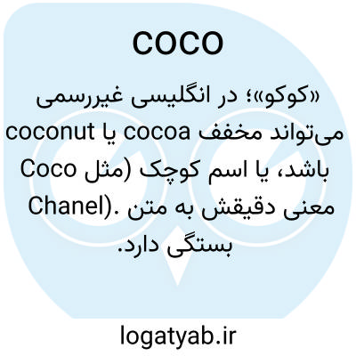 «کوکو»؛ در انگلیسی غیررسمی می‌تواند مخفف cocoa یا coconut باشد، یا اسم کوچک (مثل Coco Chanel). معنی دقیقش به متن بستگی دارد.