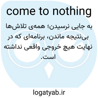 📌 همچنین، به هیچ نتیجهای نرسیدن. شکست خوردن، مانند «تمام تلاشهایش به هیچ نتیجهای نرسیده است»، یا «آخرین دور مذاکرات صلح به هیچ نتیجهای نرسید». اولین دوره به اواسط دهه ۱۵۰۰ میلادی و نوع دیگر به اوایل دهه ۱۶۰۰ میلادی برمیگردد.