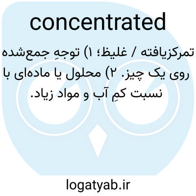 تمرکز‌یافته / غلیظ؛ ۱) توجهِ جمع‌شده روی یک چیز. ۲) محلول یا ماده‌ای با نسبت کمِ آب و مواد زیاد.