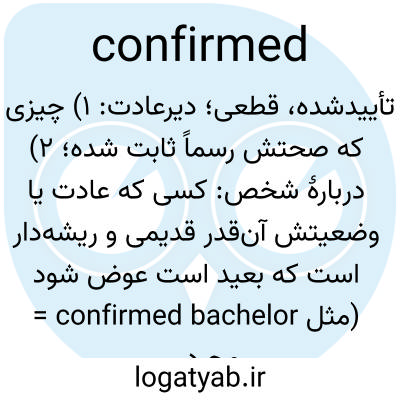 تأییدشده، قطعی؛ دیرعادت: ۱) چیزی که صحتش رسماً ثابت شده؛ ۲) دربارهٔ شخص: کسی که عادت یا وضعیتش آن‌قدر قدیمی و ریشه‌دار است که بعید است عوض شود (مثل confirmed bachelor = مجردِ قهّار).