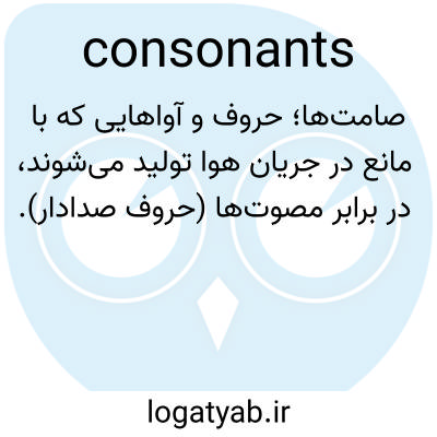 📌 حروف الفبا که نمایانگر صداهایی هستند که اغلب با دهان بسته یا نیمه بسته ساخته می‌شوند: B، C، D، F، G، H، J، K، L، M، N، P، Q، R، S، T، V، W، X، Z، و گاهی اوقات Y (مانند رنگ زرد). (مصوت‌ها را با هم مقایسه کنید.)