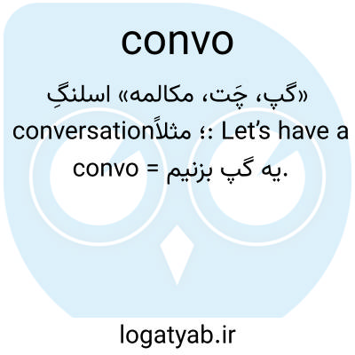 «گپ، چَت، مکالمه» اسلنگِ conversation؛ مثلاً: Let’s have a convo = یه گپ بزنیم.