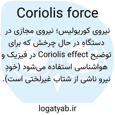📌 نیرویی فرضی که برای توضیح انحراف مسیر جسمی که در عرض جغرافیایی نسبت به زمین حرکت میکند، هنگام مشاهده از زمین، به کار میرود. این انحراف (اثر کوریولیس) به دلیل چرخش زمین است و وقتی حرکت به سمت قطب باشد، به سمت شرق است.
