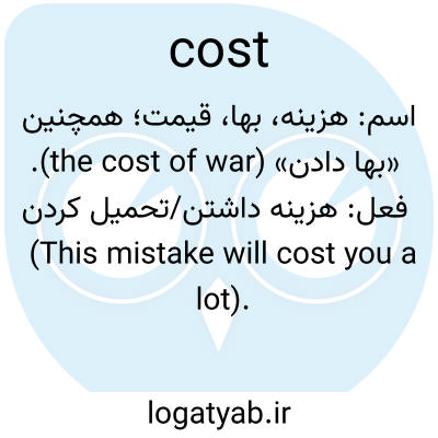 اسم: هزینه، بها، قیمت؛ همچنین «بها دادن» (the cost of war). فعل: هزینه داشتن/تحمیل کردن (This mistake will cost you a lot).