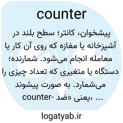 پیشخوان، کانتر؛ سطح بلند در آشپزخانه یا مغازه که روی آن کار یا معامله انجام می‌شود. شمارنده؛ دستگاه یا متغیری که تعداد چیزی را می‌شمارد. به صورت پیشوند counter- یعنی «ضد، بر ضد، متقابل» (counterattack = ضدحمله).