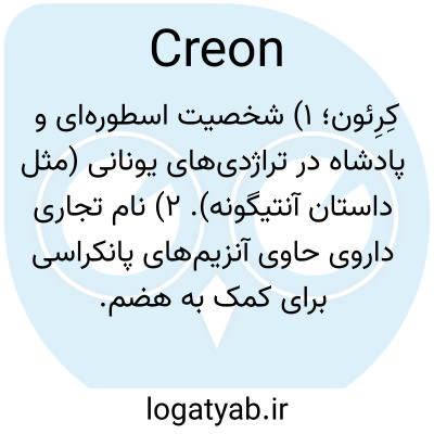 کِرِئون؛ ۱) شخصیت اسطوره‌ای و پادشاه در تراژدی‌های یونانی (مثل داستان آنتیگونه). ۲) نام تجاری داروی حاوی آنزیم‌های پانکراسی برای کمک به هضم.