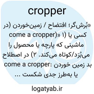 «بُرش‌گر؛ افتضاح / زمین‌خوردن (در come a cropper)» ۱) کسی یا ماشینی که پارچه یا محصول را می‌بُرَد/کوتاه می‌کند. ۲) در اصطلاح come a cropper: بد زمین خوردن یا به‌طرز جدی شکست خوردن.