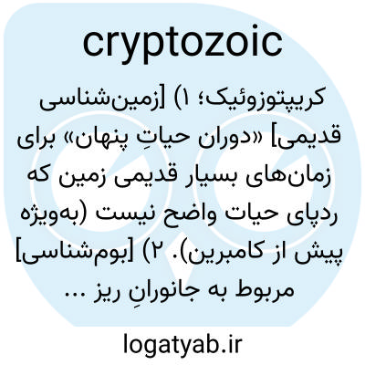 کریپتوزوئیک؛ ۱) [زمین‌شناسی قدیمی] «دوران حیاتِ پنهان» برای زمان‌های بسیار قدیمی زمین که ردپای حیات واضح نیست (به‌ویژه پیش از کامبرین). ۲) [بوم‌شناسی] مربوط به جانورانِ ریز که در زیر سنگ‌ها، پوست درخت و لایه‌های مرطوب پنهان زندگی می‌کنند.