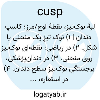 لبهٔ نوک‌تیز، نقطهٔ اوج/مرز؛ کاسپ دندان | ۱) نوک تیزِ یک منحنی یا شکل. ۲) در ریاضی، نقطه‌ای نوک‌تیز روی منحنی. ۳) در دندان‌پزشکی، برجستگی نوک‌تیز سطح دندان. ۴) در استعاره، مرز گذار بین دو وضعیت («on the cusp of change»).