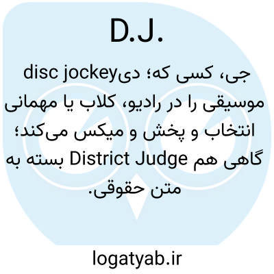 disc jockey؛ دی‌جی، کسی که موسیقی را در رادیو، کلاب یا مهمانی انتخاب و پخش و میکس می‌کند؛ گاهی هم District Judge بسته به متن حقوقی.