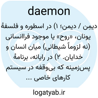 دیمِن / دیمن؛ ۱) در اسطوره و فلسفهٔ یونان، «روح» یا موجود فراانسانی (نه لزوماً شیطانی) میان انسان و خدایان. ۲) در رایانه، برنامهٔ پس‌زمینه که بی‌وقفه در سیستم کارهای خاصی را خودکار انجام می‌دهد.