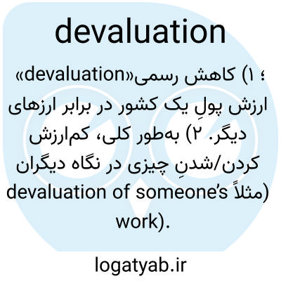 «devaluation»؛ ۱) کاهش رسمی ارزش پولِ یک کشور در برابر ارزهای دیگر. ۲) به‌طور کلی، کم‌ارزش کردن/شدنِ چیزی در نگاه دیگران (مثلاً devaluation of someone’s work).