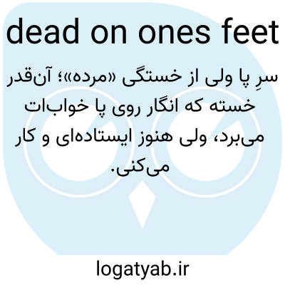📌 همچنین، کاملاً خسته. بهشدت خسته، مثلاً مامان تمام روز در آشپزخانه بود و روی پاهایش ایستاده بود، یا من دوست دارم بروم، اما کاملاً خستهام. استفاده از کلمه «مرده» برای «خسته تا حد خستگی» به اوایل دهه ۱۸۰۰ میلادی برمیگردد، و «مرده روی پا»، که تصویر یک مرده را که هنوز ایستاده است تداعی میکند، به اواخر دهه ۱۸۰۰ میلادی برمیگردد.