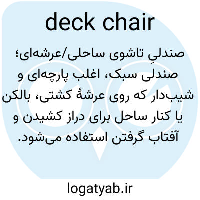 📌 صندلی تاشو، معمولاً دارای دسته و تکیهگاه پا که معمولاً برای لم دادن روی عرشه کشتیهای مسافربری استفاده میشود.