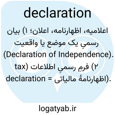 اعلامیه، اظهارنامه، اعلان؛ ۱) بیان رسمیِ یک موضع یا واقعیت (Declaration of Independence). ۲) فرمِ رسمیِ اطلاعات (tax declaration = اظهارنامهٔ مالیاتی).