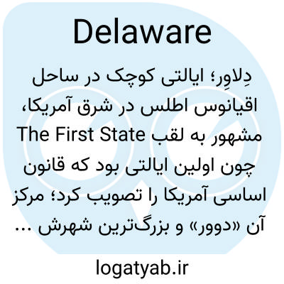 📌 ایالتی در شرق ایالات متحده، در ساحل اقیانوس اطلس. ۵۳۳۰ کیلومتر مربع (۲۰۵۷ مایل مربع). دوور. DE (برای استفاده با کد پستی)، دل.