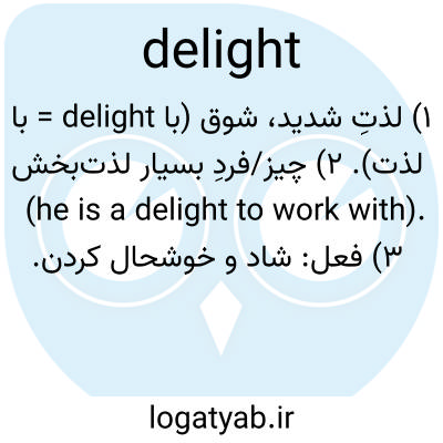 ۱) لذتِ شدید، شوق (با delight = با لذت). ۲) چیز/فردِ بسیار لذت‌بخش (he is a delight to work with). ۳) فعل: شاد و خوشحال کردن.