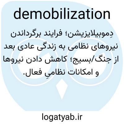 دِموبیلایزیشن؛ فرایند برگرداندن نیروهای نظامی به زندگی عادی بعد از جنگ/بسیج؛ کاهش دادن نیروها و امکانات نظامیِ فعال.