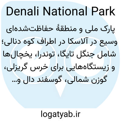 📌 یک پارک ملی در جنوب مرکزی آلاسکا، شامل دنالی (کوه). مساحت ۷۸۵۰ کیلومتر مربع (۳۰۳۰ مایل مربع).