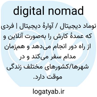 نوماد دیجیتال / آوارهٔ دیجیتال | فردی که عمدهٔ کارش را به‌صورت آنلاین و از راه دور انجام می‌دهد و هم‌زمان مدام سفر می‌کند و در شهرها/کشورهای مختلف زندگی موقت دارد.