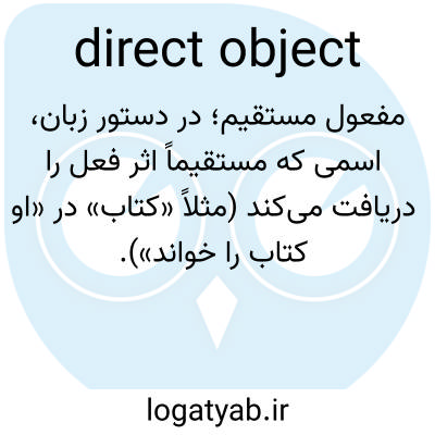 📌 کلمه یا گروهی از کلمات که نشان دهنده شخص یا چیزی است که عمل فعل بر روی آن انجام می‌شود یا به سمت آن معطوف است: در انگلیسی، معمولاً بعد از فعل می‌آید، بدون حرف اضافه. در جمله He saw it ضمیر it مفعول مستقیم saw است.