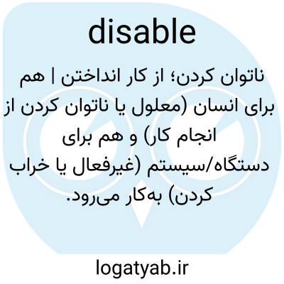 ناتوان کردن؛ از کار انداختن | هم برای انسان (معلول یا ناتوان کردن از انجام کار) و هم برای دستگاه/سیستم (غیرفعال یا خراب کردن) به‌کار می‌رود.