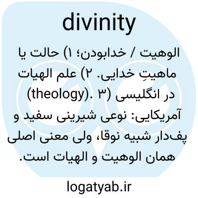 الوهیت / خدابودن؛ ۱) حالت یا ماهیتِ خدایی. ۲) علم الهیات (theology). ۳) در انگلیسی آمریکایی: نوعی شیرینی سفید و پف‌دار شبیه نوقا، ولی معنی اصلی همان الوهیت و الهیات است.